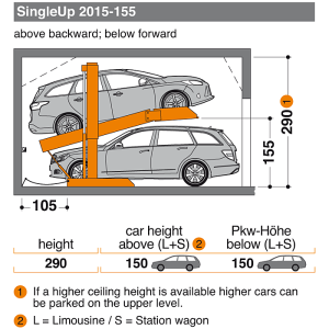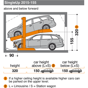Le SingleVario 2015, extrêmement compact, crée de l’espace pour deux véhicules dans des garages d’une hauteur de seulement 2,90 m. Aucune fosse n’est requise pour l’installation. Les places sont dépendantes.